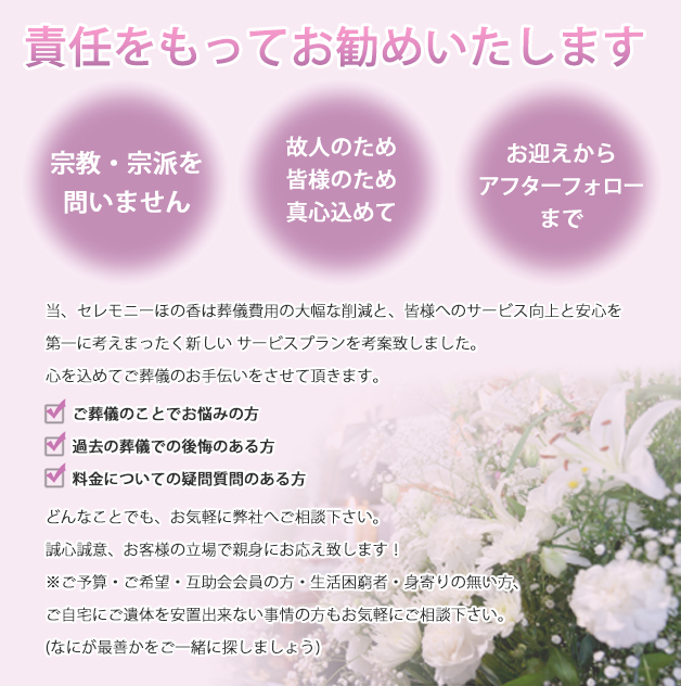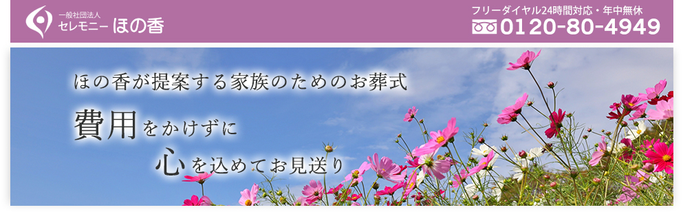 セレモニーほの香は家族葬専門です。今は、一般的に家族葬や自宅葬でお葬式を行いたいという方が増えています。また密葬、火葬式、直葬、無宗教葬儀、一日葬でという方も本当に増えています。葬儀にあまりお金をかけられない・葬儀の費用をなるべく抑えたい・供養はしたいが大きくはできない。などその理由はさまざまです。